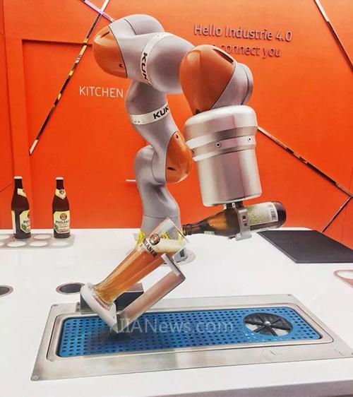 KUKA 家的展臺必有個吧臺區,吧臺區里必有明星產品:LBR iiwa 的駐守。這款世界上首臺 7 軸靈敏型機器人,在“人機協作”領域里一直所向披靡,遇上展會這樣的機會,也總愛秀秀自己那精湛的倒啤酒絕技,這次,在吧臺區,LBR iiwa 又收獲了一大幫迷弟迷妹!