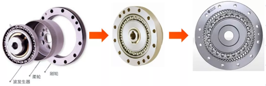 諧波減速機的結構十分簡單,是由波發生器、柔輪、剛輪三部分組成。其原理是利用柔輪與剛輪的齒數差,以及柔輪在運行時的可控形變來達到減速與傳遞動力的目的。